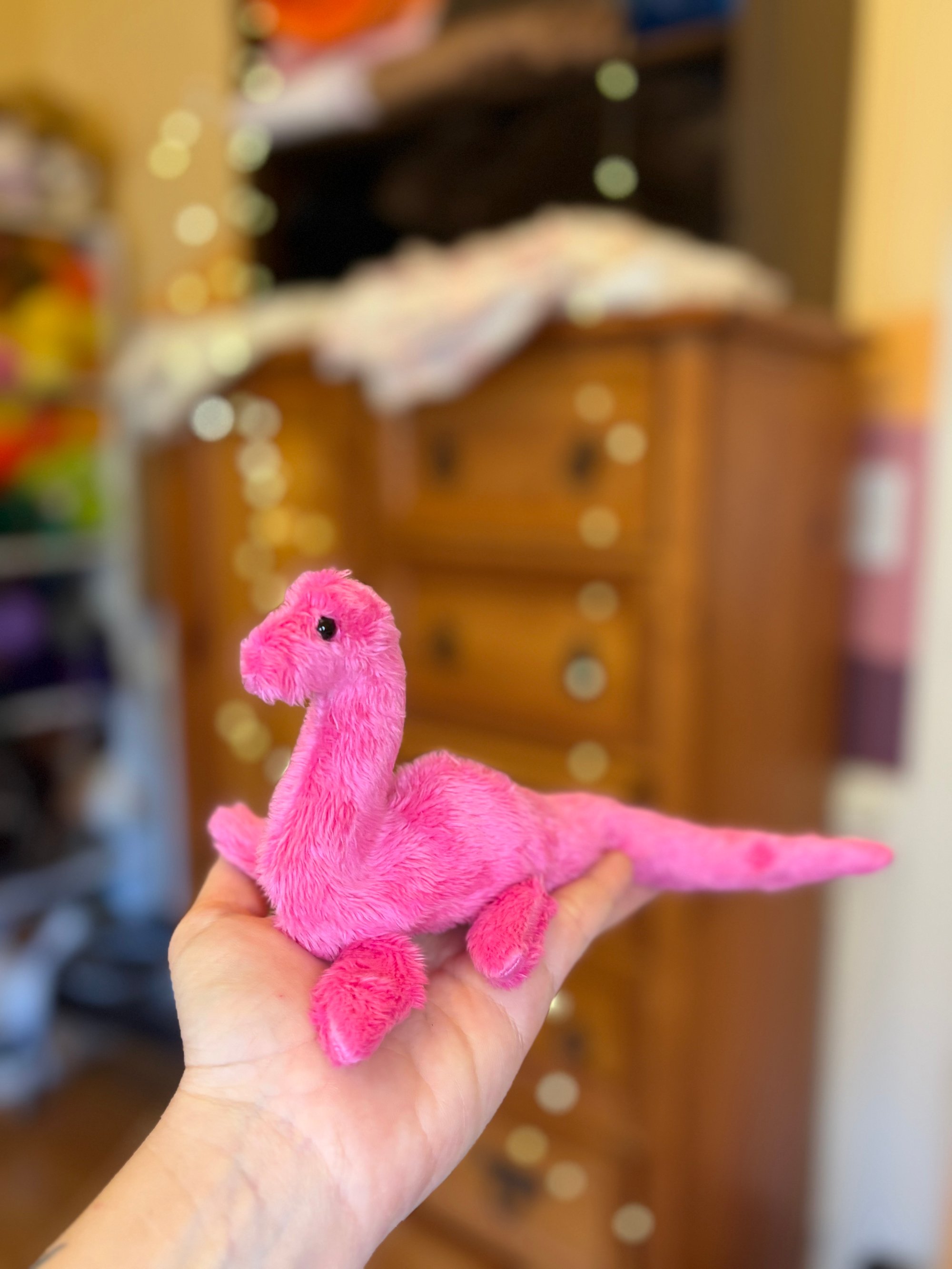 ✨This nessie beanie is handmade with so much love from a soft pink colored minky fabric and is filled with stuffing and poly-pellets for a soft and comforting floppy feel. She is the perfect size for carrying with you to bring on adventures!